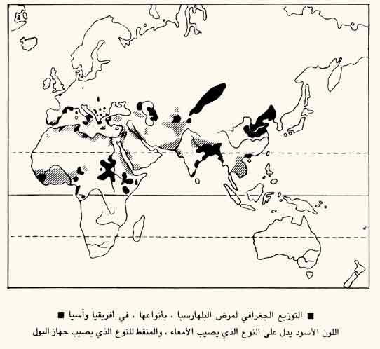 أعمال الري، والمرض منتشر بصورة كبيرة في أفريقيا وآسيا، والخريطة المرفقة تعطي بعض المعلومات عن أماكن وجوده في العالم الأفريقي والآسيوي.